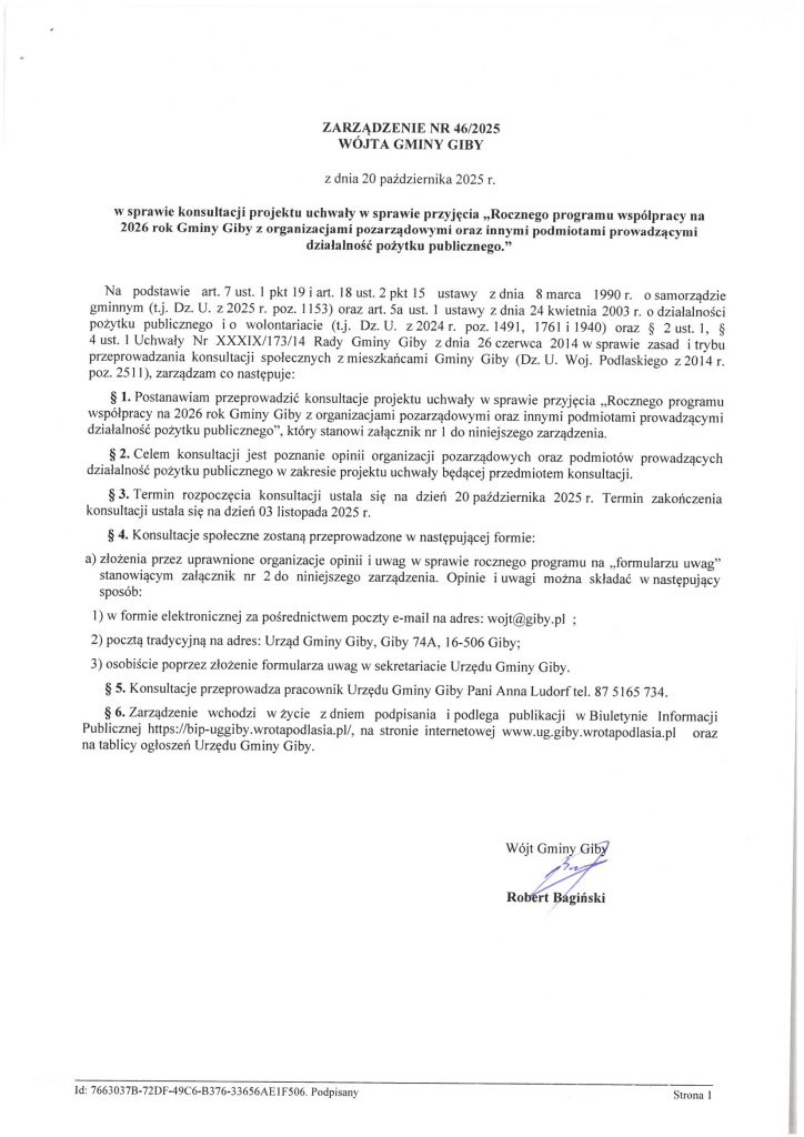 Informacja o wynikach konsultacji społecznych w sprawie konsultacji projektu uchwały w sprawie przyjęcia „Rocznego programu współpracy na 2022 rok Gminy Giby z organizacjami pozarządowymi oraz innymi podmiotami prowadzącymi działalność pożytku publicznego”