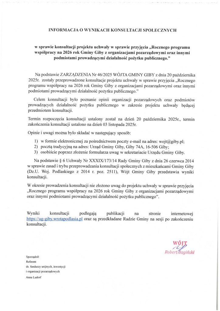 Informacja o wynikach konsultacji społecznych w sprawie konsultacji projektu uchwały w sprawie przyjęcia „Rocznego programu współpracy na 2022 rok Gminy Giby z organizacjami pozarządowymi oraz innymi podmiotami prowadzącymi działalność pożytku publicznego”