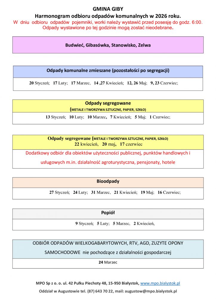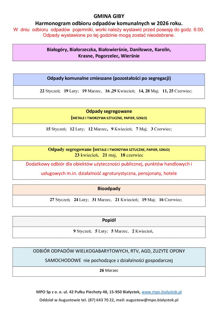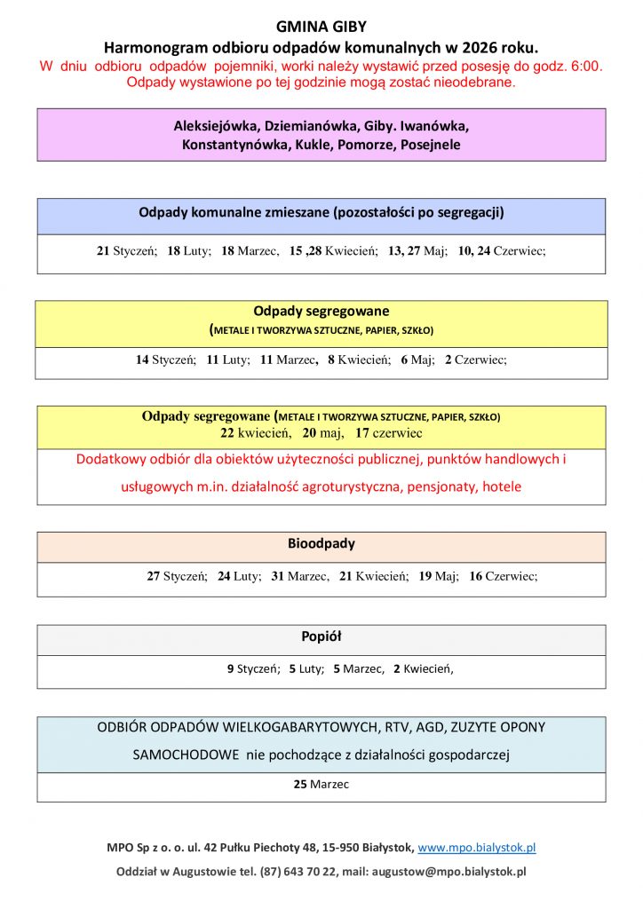 Harmonogram odbioru odpadów komunalnych w 2026 roku.