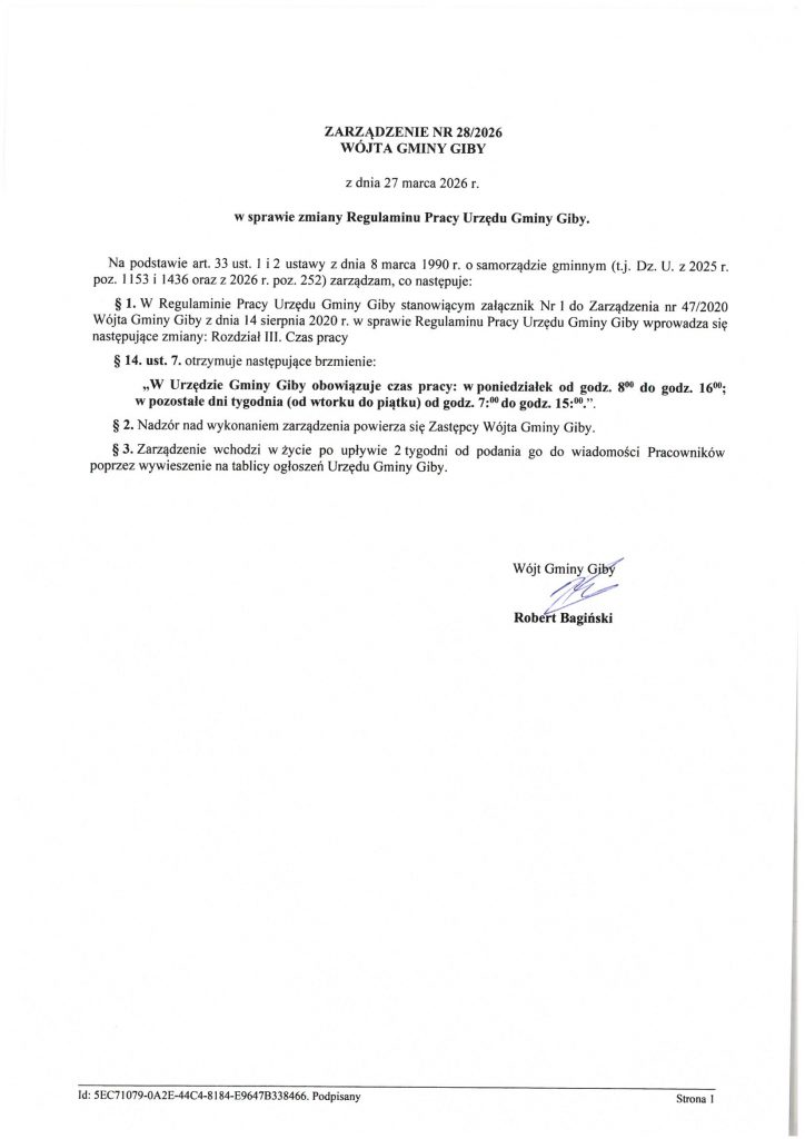 Zarządzenie w sprawie zmiany regulaminu pracy Urzędu Gminy Giby